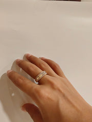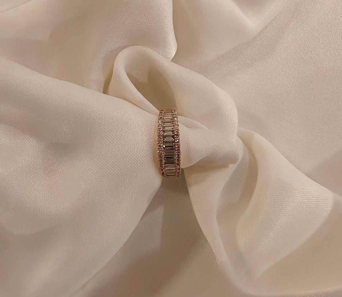 A line of baguette diamonds set between two rows of round diamonds makes for this classic statement diamond ring. This is designed keeping we arability in mind, it circles the finger seamlessly covering 3/4th of the band, keeping the bottom diamond free so they don't get in the way or get damaged so you can wear it with ease.